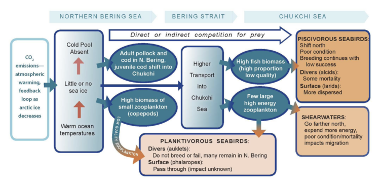 Figure 1. Reprinted from Kuletz et al. 2024b. A conceptual model illustrating the physical drivers and biological components of the Chukchi Sea ecosystem that can affect seabirds during marine heatwave years. During 2017–2019, conditions in the Bering Sea (left side) led to lack of a thermal barrier for juvenile pelagic fish and increased the transport of heat, nutrients, zooplankton, and fish through Bering Strait (center) into the Chukchi Sea (right side). Planktivorous seabirds (breed in the Bering Sea and Bering Strait) can be directly affected by lack of large zooplankton, and their post-breeding migration to the Chukchi curtailed. Piscivorous seabirds (breed in Bering and Chukchi regions) can be directly and indirectly affected via competition with pelagic fish, but surface foragers can search farther for prey. Shearwaters (non-breeding migrants) can be impacted by lack of sufficient, high-lipid prey and perhaps, by the energetic cost of traveling farther north in search of prey.